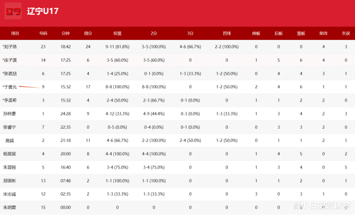 这场比赛被上调辽宁男篮一队的17岁小将于善元继续先发登场,但他仅仅打了15分钟就打卡下班,全场比赛8中8,罚球2中1,拿到17分6篮板1助攻1抢断2盖帽,命中率100%,于善元首次以100%命中率提前打卡下班。